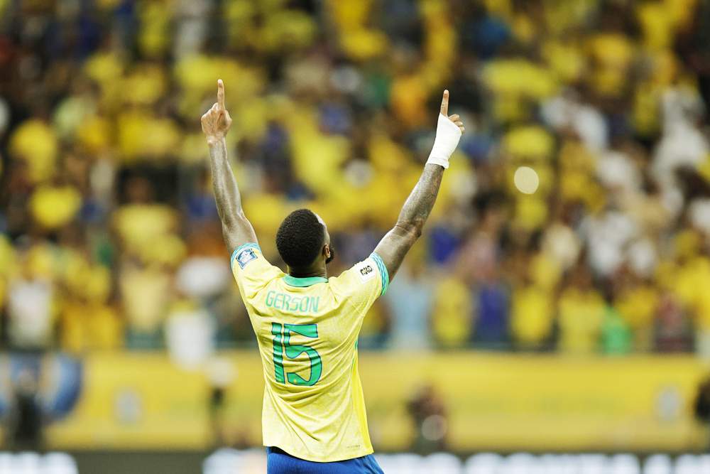 El centrocampista del Flamengo celebraba así su primer gol con la Canarinha que a su vez maquillaba las dificultades de la selección para dominar en el último partido de eliminatoria de brasileños y uruguayos en el año.