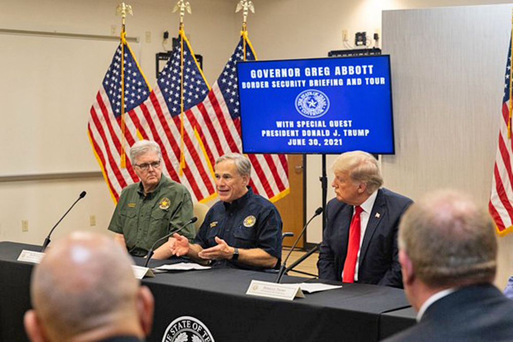 McAllen.- El gobernador Greg Abbott llevó a cabo el miércoles lo que llamó una sesión informativa sobre seguridad fronteriza en la que tuvo como invitado al ex presidente Donald Trump en esta ciudad, además de funcionarios estatales y fuerzas policiacas locales.