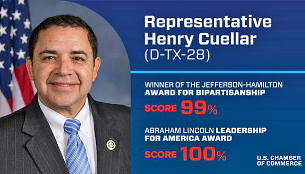 Washington, D.C.— El congresista Henry Cuéllar (D-TX-28) recibió el premio Abraham Lincoln Leadership for America Award y el premio Jefferson-Hamilton al Bipartidismo otorgado por la Cámara de Comercio de los Estados Unidos. Estos dos premios se entregan a los miembros del Congreso que demuestran liderazgo bipartidista y un gobierno constructivo necesario para hacer avanzar a nuestro país.