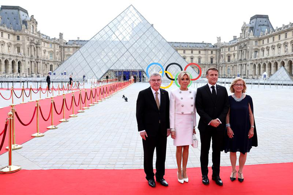 (240725) -- PARIS, 25 julio, 2024 (Xinhua) -- El presidente del Comité Olímpico Internacional (COI), Thomas Bach (i) y su esposa Claudia Bach (d) posan con el presidente francés, Emmanuel Macron (2-d) y su esposa Brigitte Macron durante la Cena del COI y el Elíseo en el Louvre, en París, Francia, el 25 de julio de 2024. (Xinhua/Arturo Holmes/POOL) (ra) (ah)