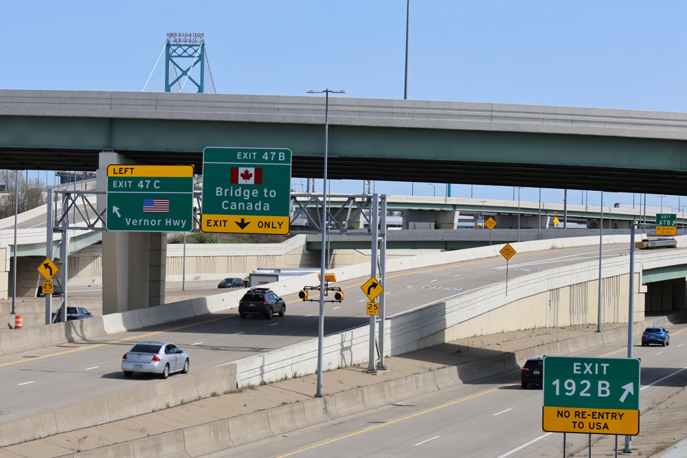 El Ambasador Bridge, la principal vía de acceso entre ambas ciudades, viene precedido en el lado estadounidense por un complejo nudo de autopistas en el que es fácil equivocarse y acabar en uno de los carriles que indica “solo para Canadá”.