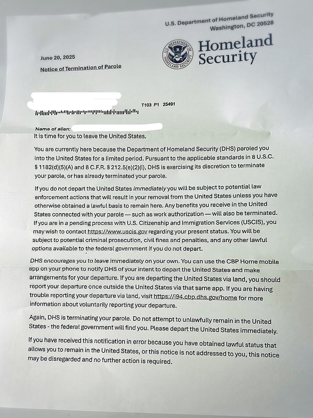 “Actualmente te encuentras aquí porque el Departamento de Seguridad Nacional (DHS) te otorgó un permiso de entrada condicional a Estados Unidos por un período limitado. El DHS está ejerciendo su discreción para cancelar tu permiso de entrada condicional, o ya lo ha hecho”, agrega.