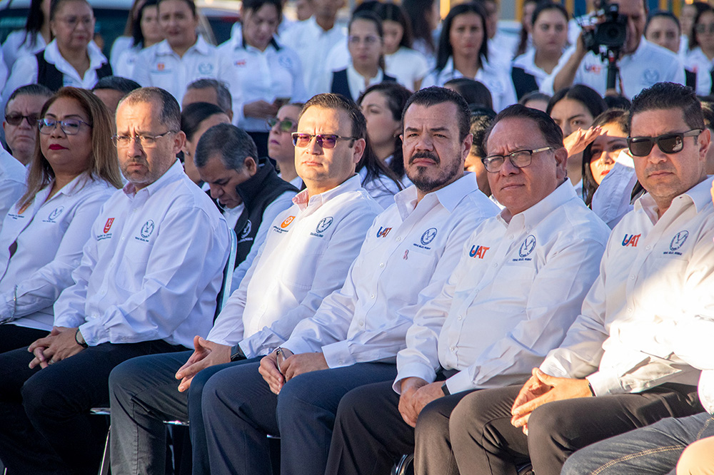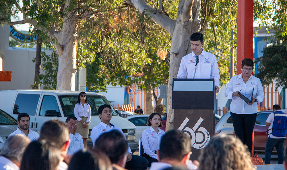 De igual manera, participaron: el Lic. Janitzio Uriel Salazar Marín, alumno de la Maestría en Ciencias en Orientación de Trabajo Social, quien dirigió la entonación del himno nacional; del alumno de la carrera de Psicología, Jesús Gabriel Puga Hernández, que hizo el juramento a la bandera; en tanto que la lectura de las efemérides y fechas importantes nacionales y estatales estuvo a cargo de Kkrytzell Amairani Quevedo Saucedo y Jorge Martínez Perales, estudiantes de las licenciaturas de Psicología y Nutrición, respectivamente.