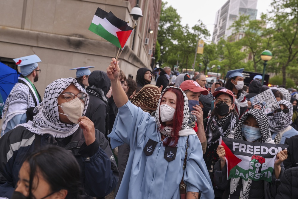La protestas comenzaron a las 10:30 hora local, y casi una hora después las fuerzas de seguridad de Nueva York se abrieron paso entre la multitud que se manifestaba por Palestina y arrestó a una persona, que portaba la toga azul celeste de la universidad y una banda con el patrón del pañuelo palestino (‘kufiya’).