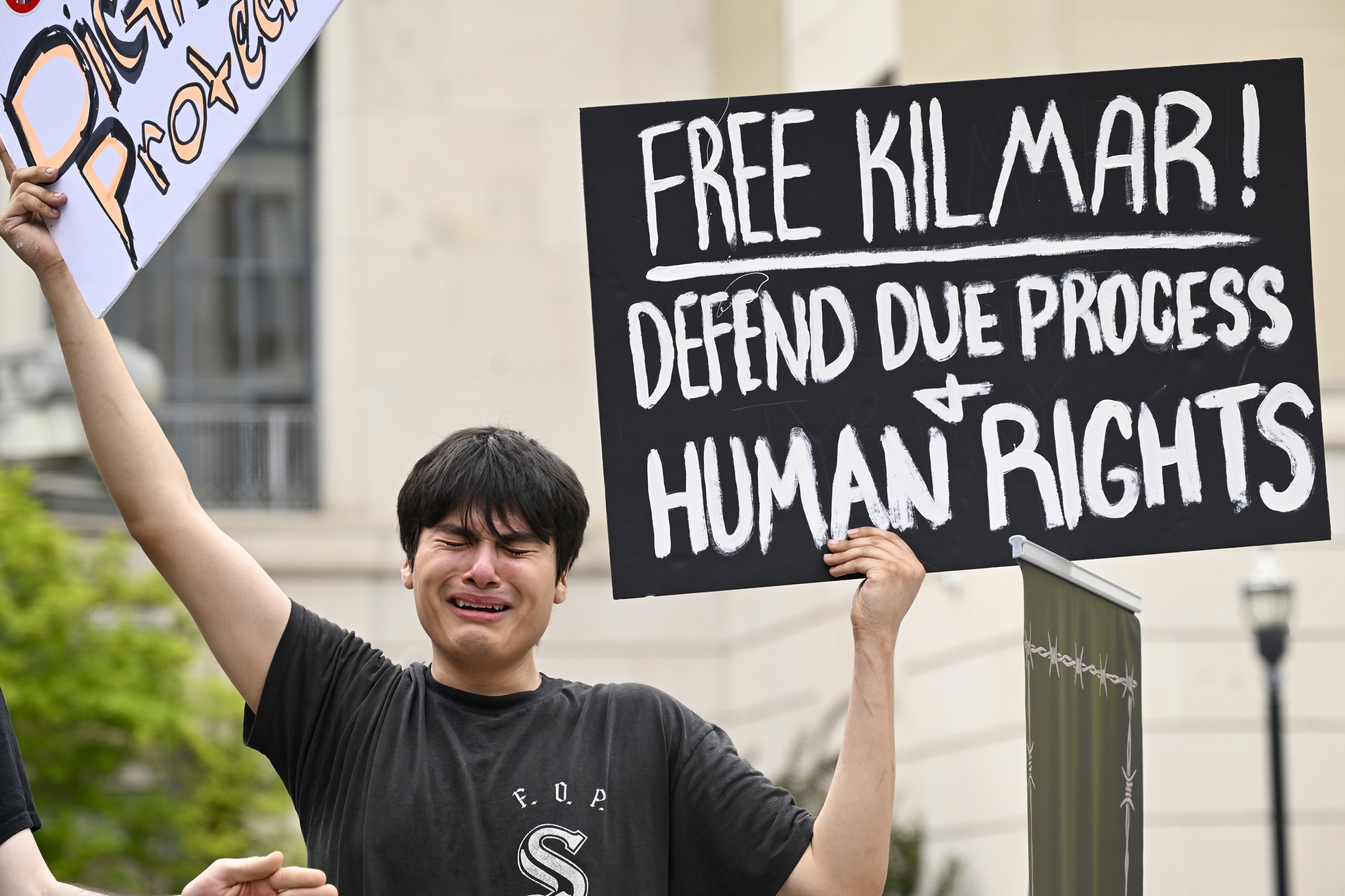 Decenas de activistas se congregaron fuera de la corte de Maryland este lunes durante la audiencia para exigir la liberación del migrante, respeto al debido proceso y el fin de las deportaciones masivas, además de expresar su apoyo al salvadoreño.