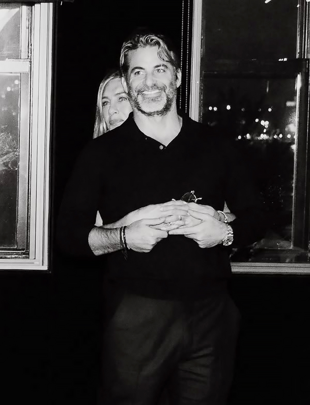 En la fotografía en blanco y negro, Aniston, de 56 años, rodea por la espalda a Curtis, de 50, mientras este esboza una amplia sonrisa y toma sus manos.
