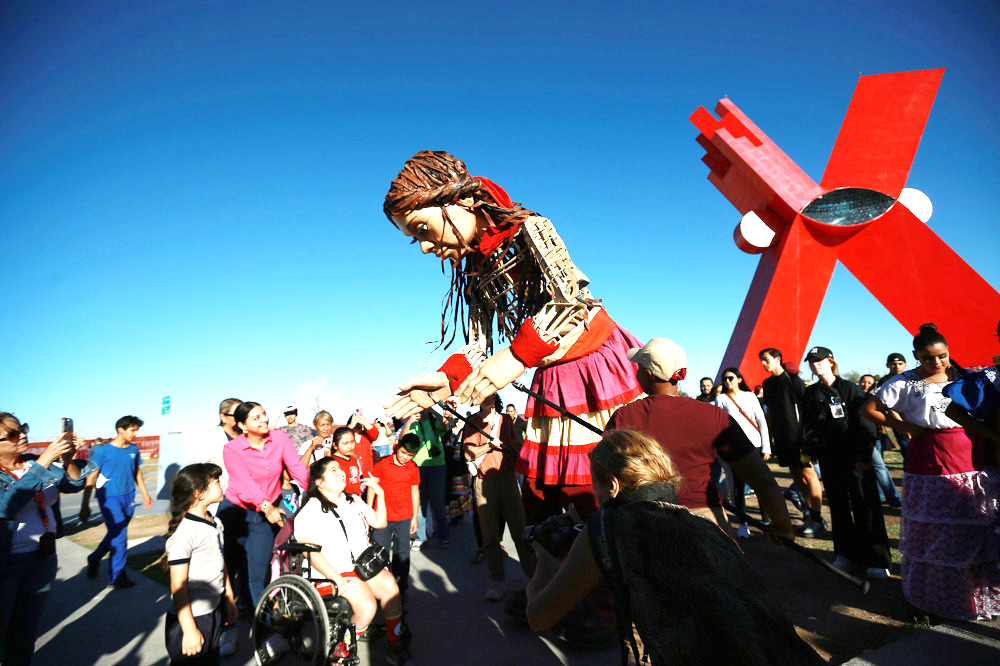 Ciudad Juárez (México), (EFE).- Una niña migrante gigante, de casi 4 metros de alto, se balancea para poder subir el bordo del Río Bravo en Ciudad Juárez. Se trata de “La Pequeña Amal”, una muñeca que representa a una niña siria que recorre el mundo buscando un nuevo hogar, en un proyecto de la Organización de las Naciones Unidas, a través del Alto Comisionado de las Naciones Unidas para los Refugiados (ACNUR).