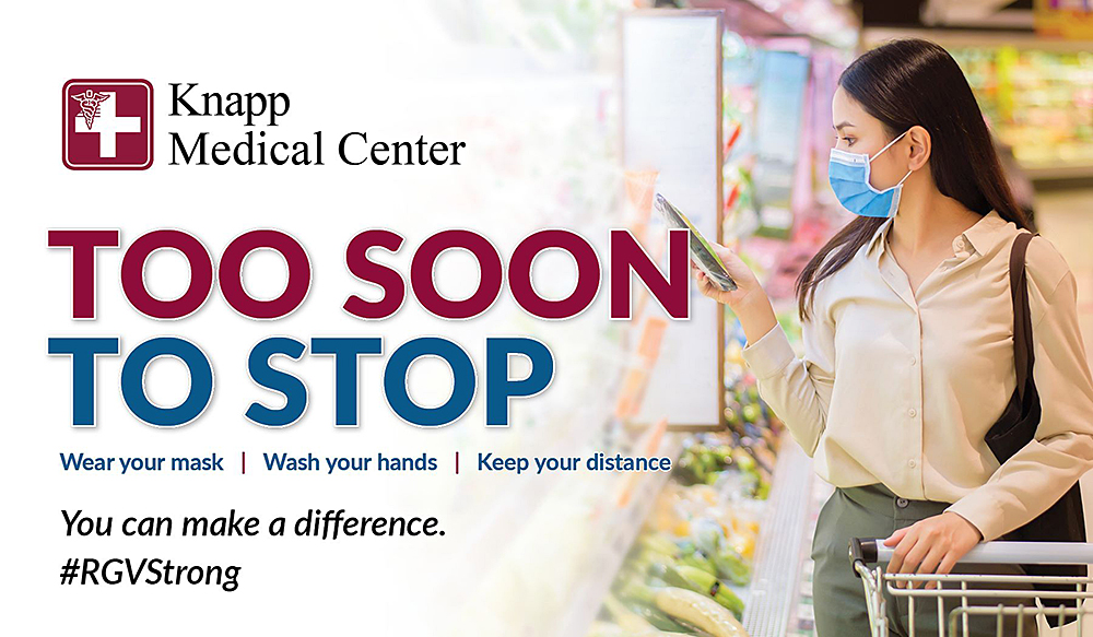 Weslaco.- En la batalla en curso contra COVID-19, los médicos locales y el Centro Médico Knapp instan a la comunidad a que continúen tomando las debidas precauciones, como usar una máscara o cubrirse la cara, mantener una distancia de seis pies entre usted y otras personas, evitar viajes y salidas innecesarias, y lavarse las manos durante 20 segundos completos.