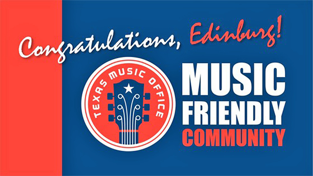 Edinburg se une a más de otras 30 ciudades de Texas que han recibido la designación oficial de “Music Friendly Community”, incluidas Abilene, Alpine, Arlington, Austin, Bastrop, Brenham, Bryan, Conroe, Dallas, Denison, Denton, Dripping Springs, El Paso, Fort Worth, Grand Prairie, Harker Heights, Lindale, Lubbock, McAllen, McKinney, Nacogdoches, New Braunfels, Odessa, Port Aransas, Round Rock, Salado, San Angelo, San Antonio, San Marcos, Stephenville, Victoria, Vidor, Waco, Waxahachie y Wimberley.