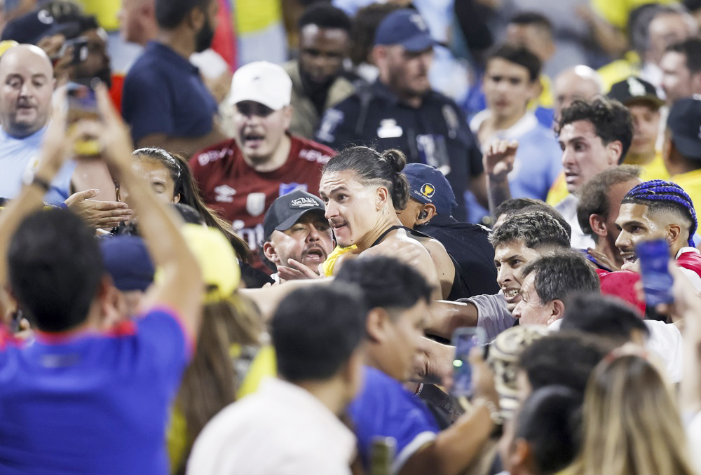 Charlotte (EE.UU.), (EFE).- Varios jugadores uruguayos, entre ellos Darwin Núñez, Ronald Araújo y José María Giménez saltaron a la grada para pelear con hinchas colombianos una vez finalizado el partido de este miércoles de semifinales de la Copa América entre Uruguay y Colombia.