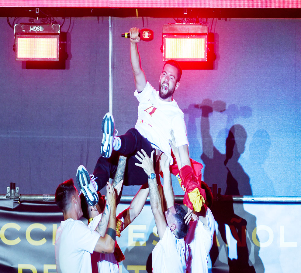 MADRID, (Xinhua) — Imagen de jugadores de la Selección Nacional Española festejando el título de la EURO 2024 de la UEFA con los aficionados en la Plaza de Cibeles, en Madrid, España. (Xinhua/Gustavo Valiente)
