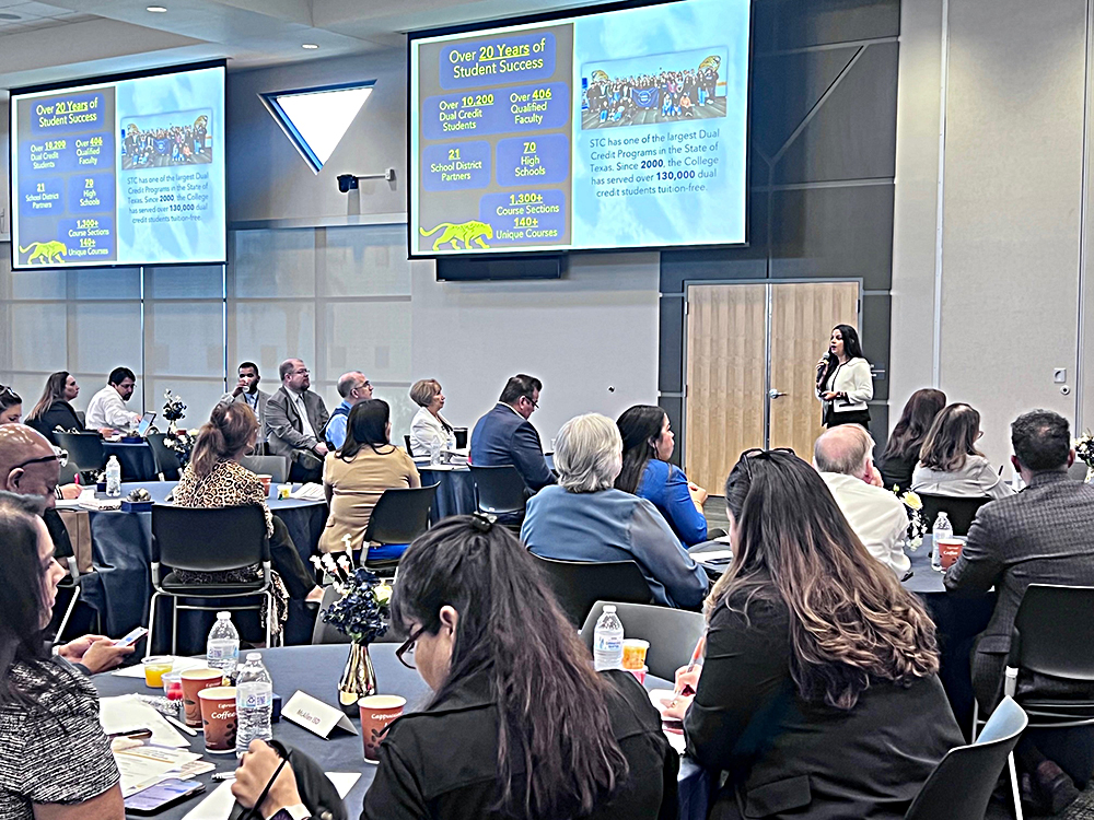 De Hoyos expresó su agradecimiento durante la reciente reunión anual de liderazgo de la universidad, donde los superintendentes y educadores de los 21 distritos escolares asociados de la universidad se reúnen para obtener información sobre el estado del programa de crédito dual, las métricas de éxito de los estudiantes y otras actualizaciones.