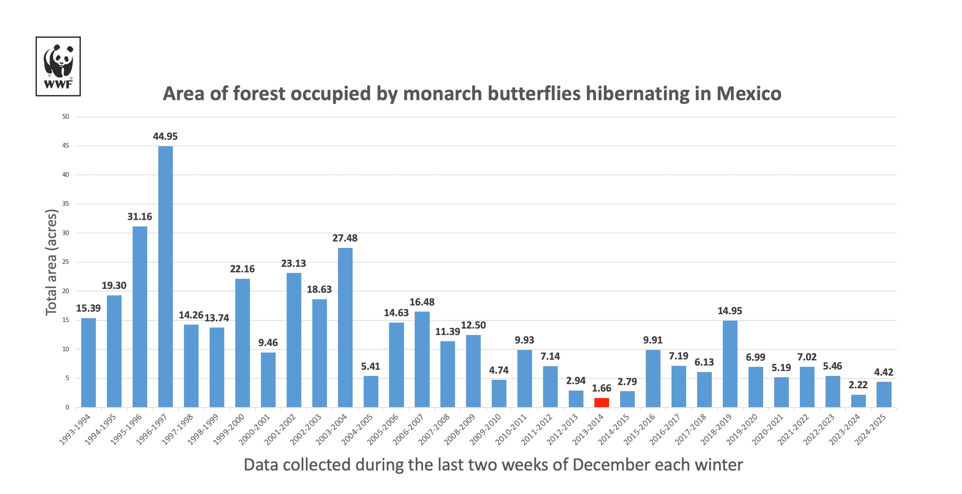 Este crecimiento del 99 % fue reportado en la presentación del informe elaborado por la Conanp en colaboración con el Fondo Mundial para la Naturaleza (WWF, en inglés), donde se destacó este esfuerzo de preservación “como un ejemplo de cooperación tripartita entre México, Estados Unidos y Canadá”, al ser estos países parte de la ruta de los casi 4.000 kilómetros que atraviesa la monarca.