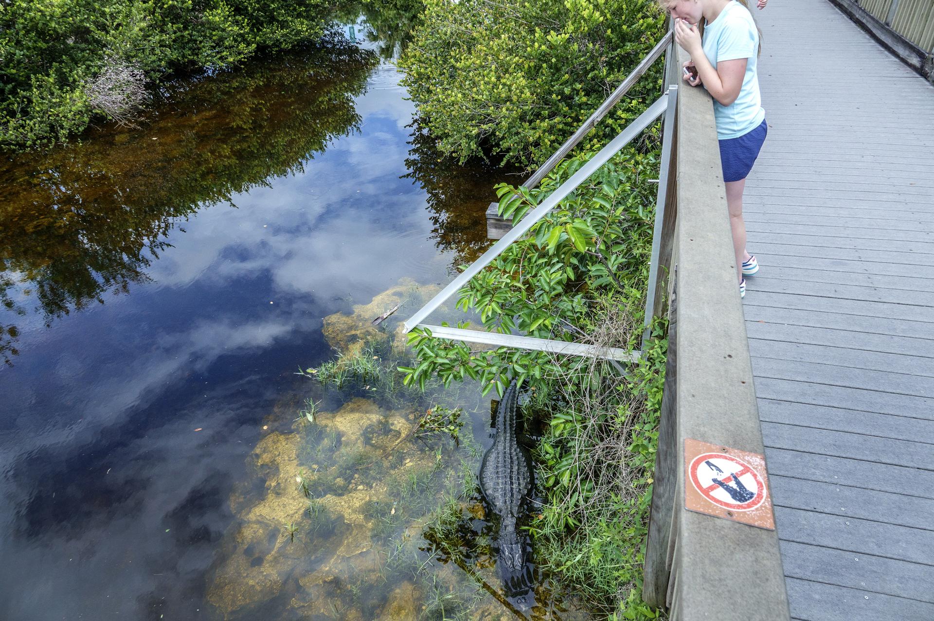Turistas se fotografiaban desde este fin de semana bajo el letrero de ‘Alligator Alcatraz’ que colocó el Gobierno de Florida hace dos semanas para marcar la apertura del centro de detención en un aeropuerto abandonado al oeste de Miami rodeado de caimanes, pitones, panteras y pantanos.