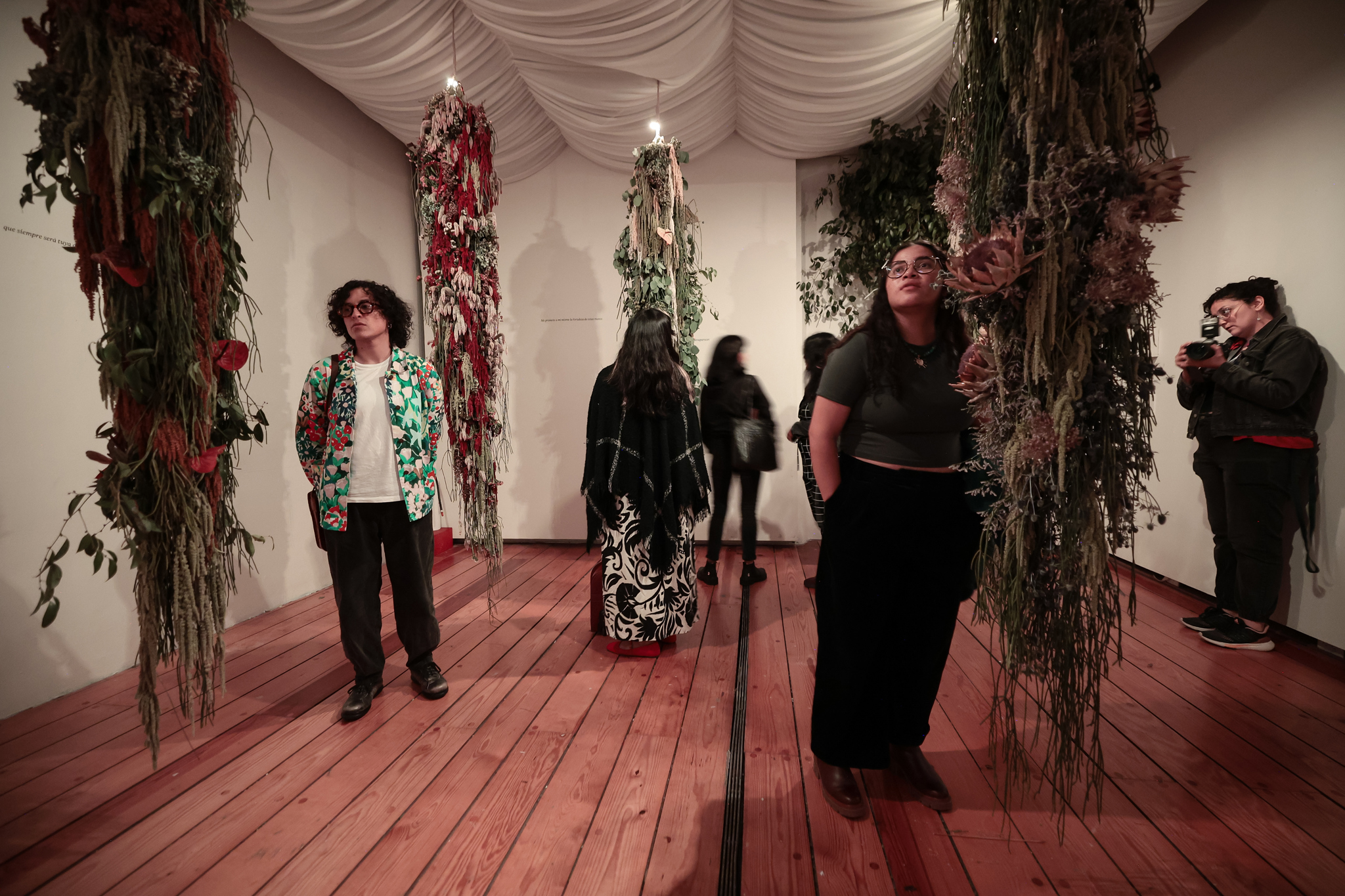 Junto a esos ramos que suenan y se iluminan con el abrazo a las flores, se encuentra un pequeño árbol invertido del que cuelgan “hilitos con unas promesas que escribieron niñas hacia ellas mismas, las cuales llegan a tu mano de una manera que no es casualidad”, señaló Burciaga.