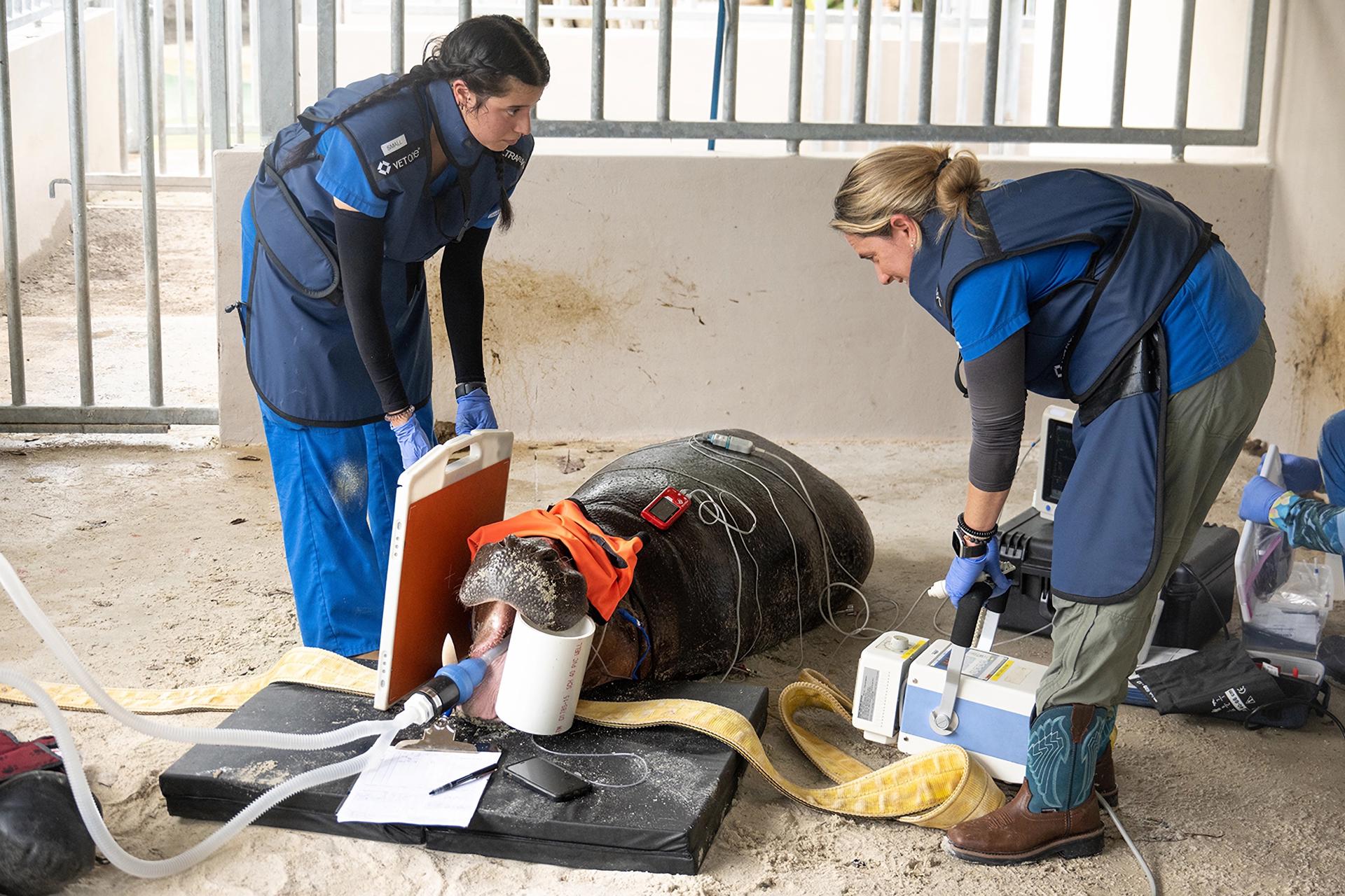 El hipopótamo macho recibió durante el examen del miércoles pruebas completas que incluyeron radiografías, exámenes de ultrasonido, endoscopia de los senos y análisis de sangre para evaluar su condición.
